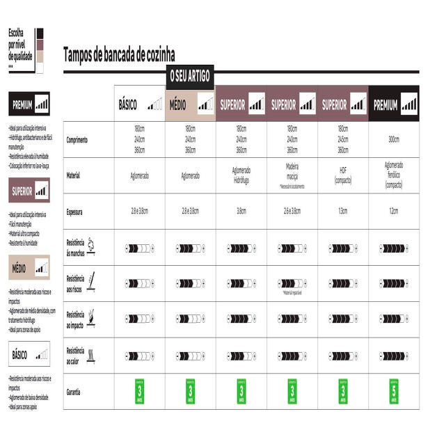 | Conselho de manutenção | Para conservar toda a estética e funcionalidade da sua bancada de trabalho ao longo do tempo, utilizar uns suportes para pratos para pousar os seus pratos e panelas, uma tábua de corte para cortar os seus alimentos e utilizar silicone para todas as junçõe |