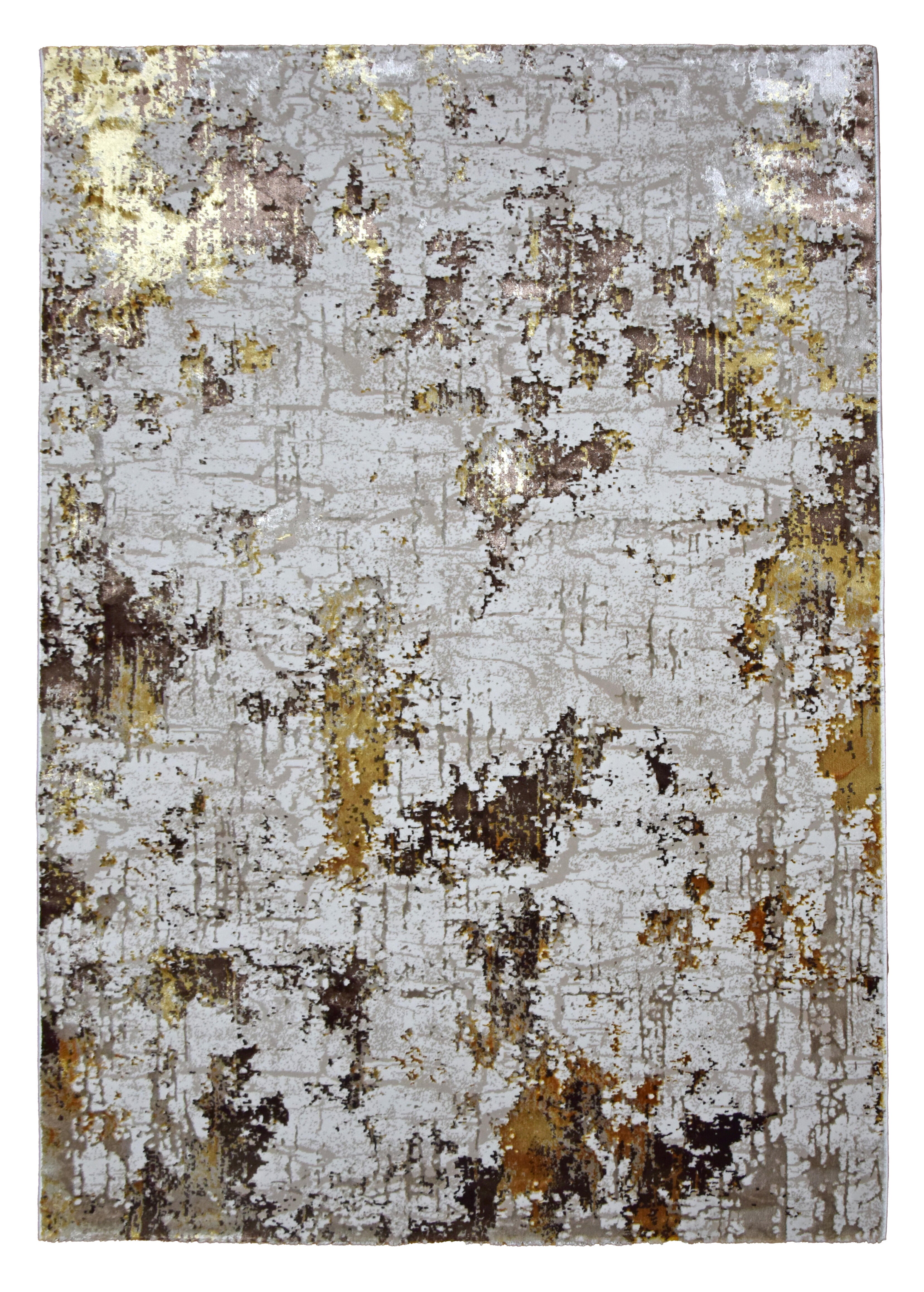 Tapete de uso interior M. A. Salgueiro, em padrão abstrato, na cor castanho, bege e dourado, fabrico mecânico, estilo moderno e forma retangular, acabamento cortado. Formato pequeno. Medidas: 080 cm de largura e 150 cm de comprimento. Altura do pêlo: 8 mm. 100% poliéster. Peso NET sem embalagem: 2 Kilogramas. Manutenção: Aspiração regular e lavagem manual com àgua e sabão. Não branquear. Não utilizar máquina de secar, nem engomar. A garantia do produto é de 3 anos. Fabricado na Turquia