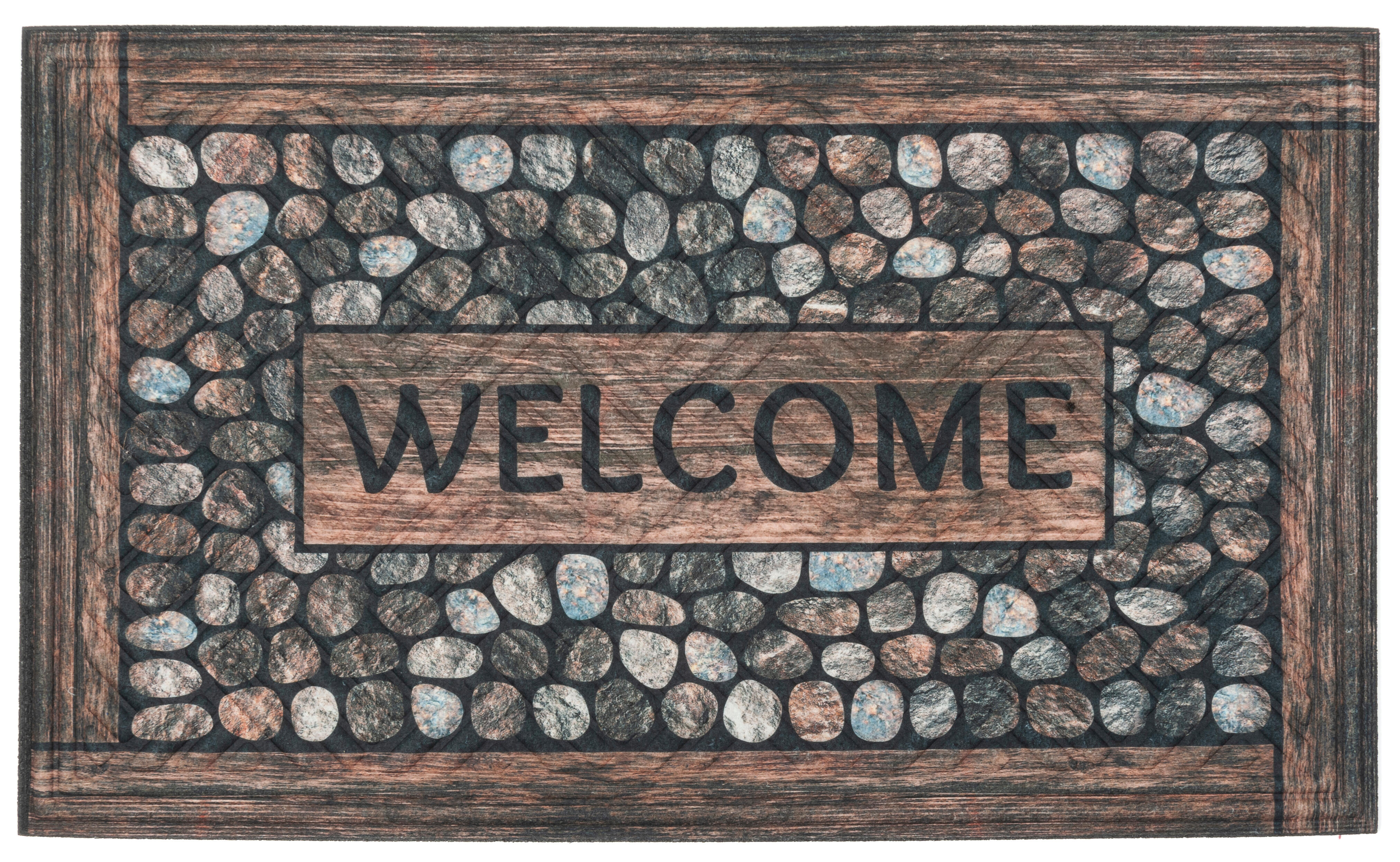 Tapete de poliéster castanho com estampado de pedras e a palavra "Welcome". A sua parte de baixo é feita com borracha reciclada de pneus e é antideslizante. Fácil de limpar, sacudir, aspirar ou lavar com mangueira. Superfície de poliéster reciclado, com impressão digital de alta resolução. Este produto é uma Ecopção da categoria Economia Circular, que engloba os produtos Leroy Merlin reparáveis, recicláveis e reutilizáveis; são totalmente fabricados com materiais reciclados e recicláveis cuja pegada de carbono foi calculada e compensada. Medidas: 75 x 45 cm (largura x comprimento).