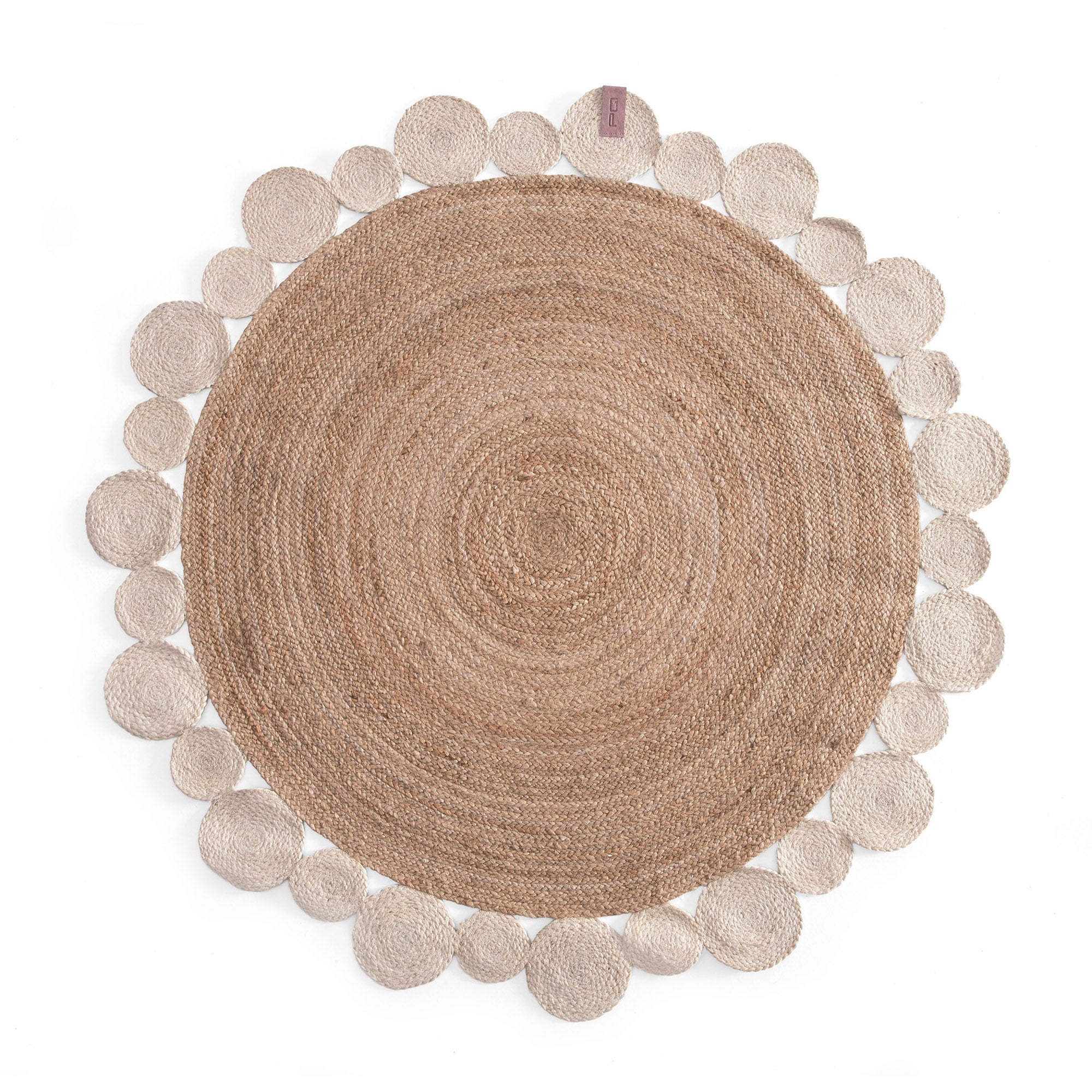 Tapete infantil em juta, com desenho circular em tons naturais e brancos. Perfeito para qualquer quarto ou quarto de criança. É um produto sustentável pois é feito à mão com materiais