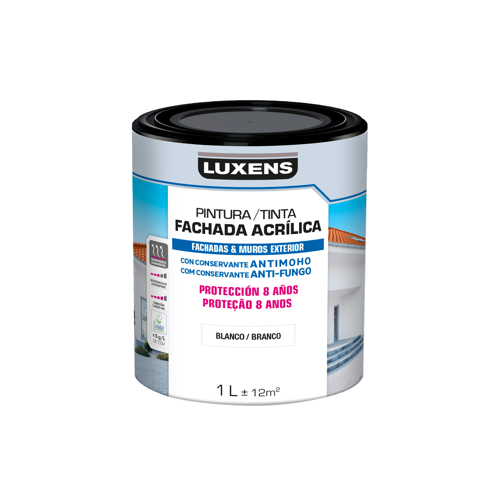 Tinta acrílica para fachadas LUXENS de cor branca com acabamento mate, ideal para proteger e embelezar fachadas e paredes exteriores. Graças à sua fórmula de base acrílica, esta tinta permite a evaporação da humidade e cobre as imperfeições. Resistente às intempéries e aos raios UV, esta tinta proporciona uma proteção até 8 anos e uma estabilidade da cor ao longo do tempo. Fácil de aplicar sem pulverizar. Limpeza das ferramentas com água. A nossa tinta Luxens tem o rótulo ecológico, este rótulo certifica os produtos pelo seu desempenho técnico, a sua quantidade limitada de substâncias perigosas e o seu baixo nível de compostos orgânicos voláteis, menos de 5g/l de COV.