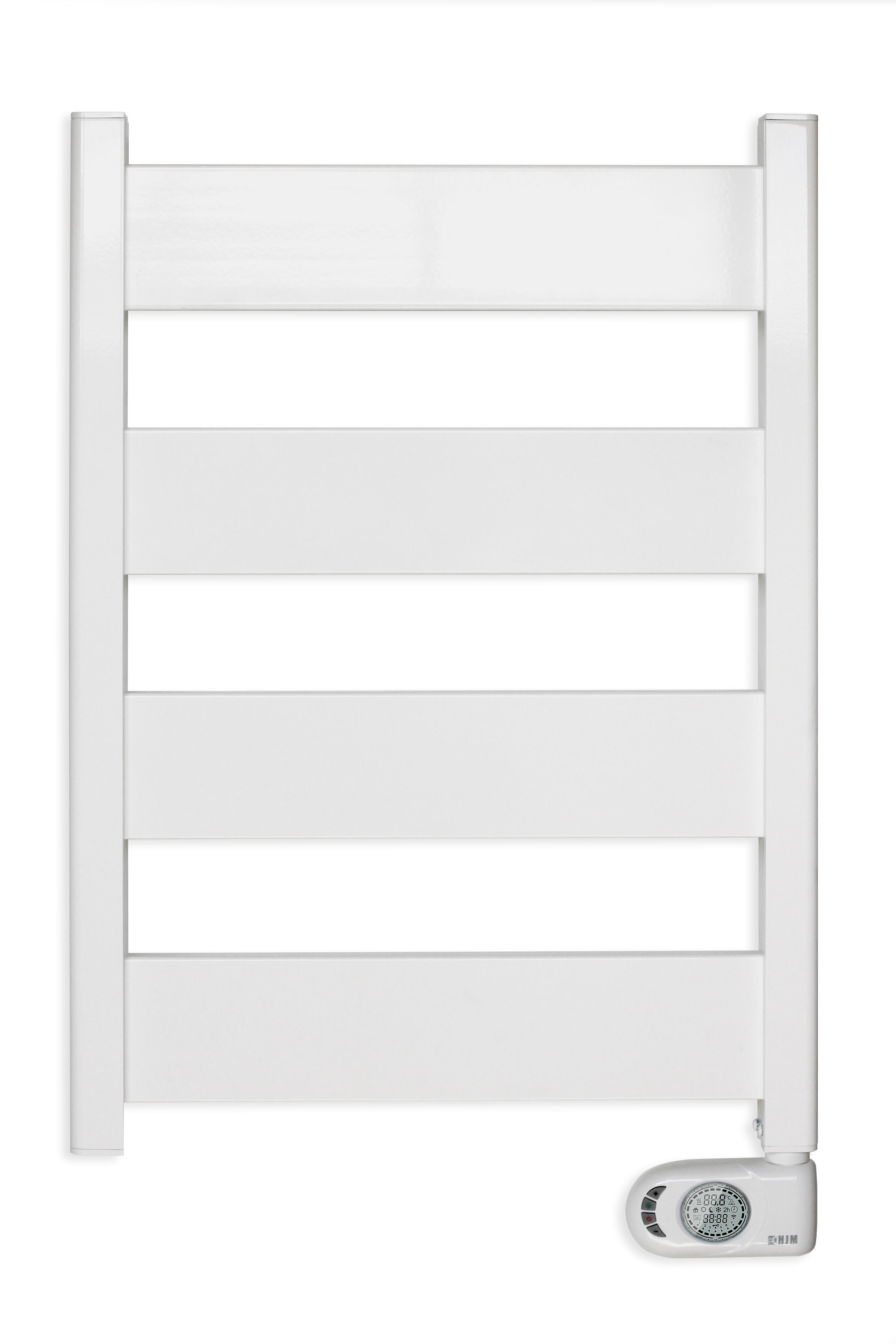 Toalheiro eléctrico em alumínio na cor branco com 500 W de potência, ideal para aquecer uma área de cerca de 5 m², bem como para secar toalhas. Tem um radiador de forma recta com tubo redondo, que pode ser programado diariamente, e um visor digital para o controlar. Medidas: 50,5 x 78 x 10 cm (largura x altura x profundidade).