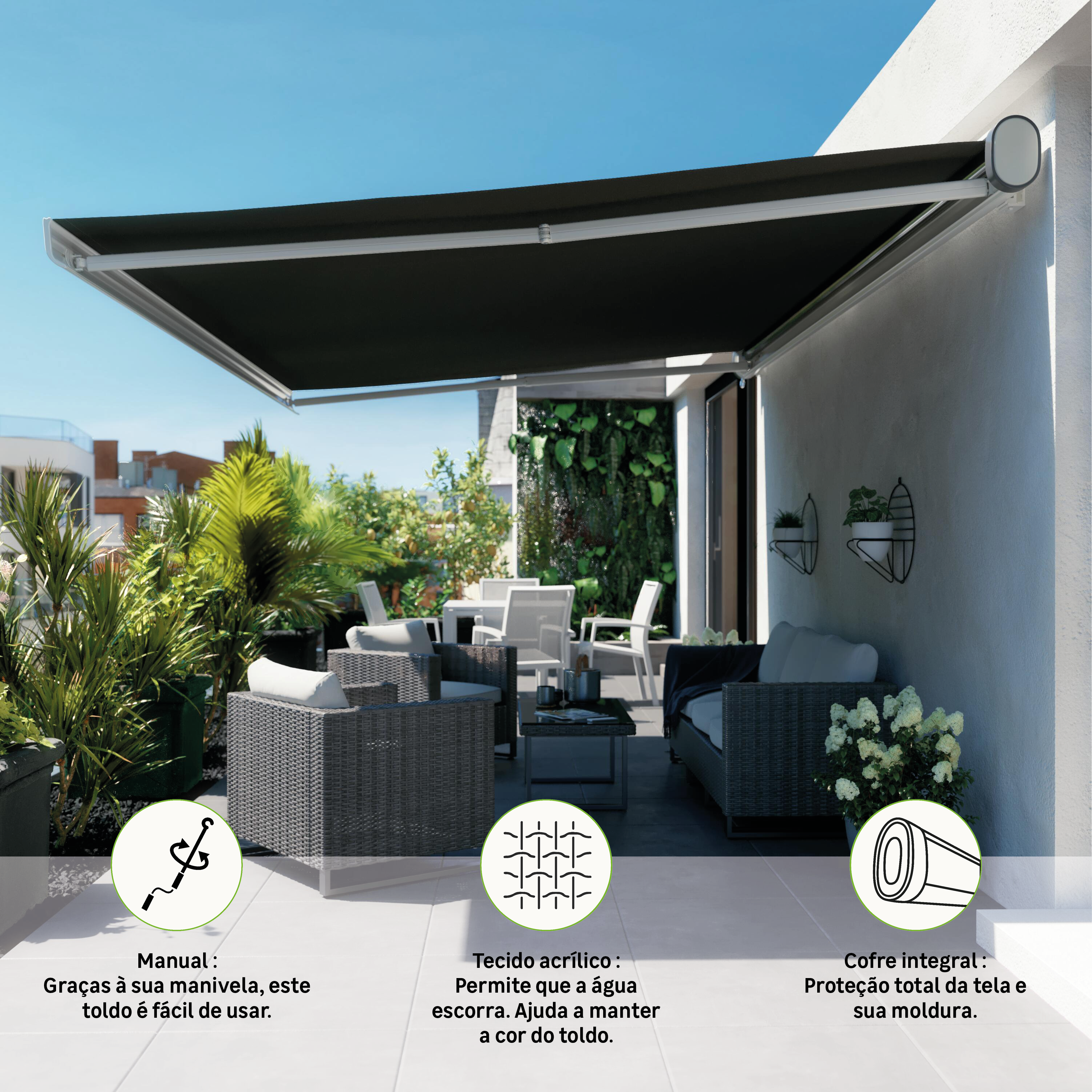 Ideal para criar um espaço ao ar livre para aproveitar o seu terraço ou varanda enquanto se protege do sol. Com tela de 3,95x3 m em tecido acrílico de alta qualidade que fornece uma boa resistência à descoloração e uma proteção superior contra os raios UV. Na chuva moderada, o tecido faz deslizar a agua sem penetrar. Este toldo com design simples e apresenta-se com cofre integral completo que protege o tecido os braços e o motor do desgaste climático e da sujidade. Permitindo assim uma menor necessidade de manutenção e garantindo consequentemente uma vida útil do produto. Também disponível na versão motorizada de (Modelo) e Nori 2 LED (LED NORI Modelo 2) em várias cores. Usamos packaging sustentável para garantir um menor impacto ambiental, por utilizar cartão reciclado. O packaging é monocromático de maneira a usar menos tinta.