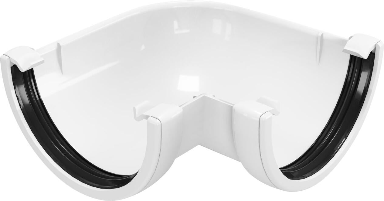 Ângulo de 90° para calha de ø120mm, fabricada em PVC, com um formato arredondado e cor branca. Medida (interior): 120 mm de diâmetro.