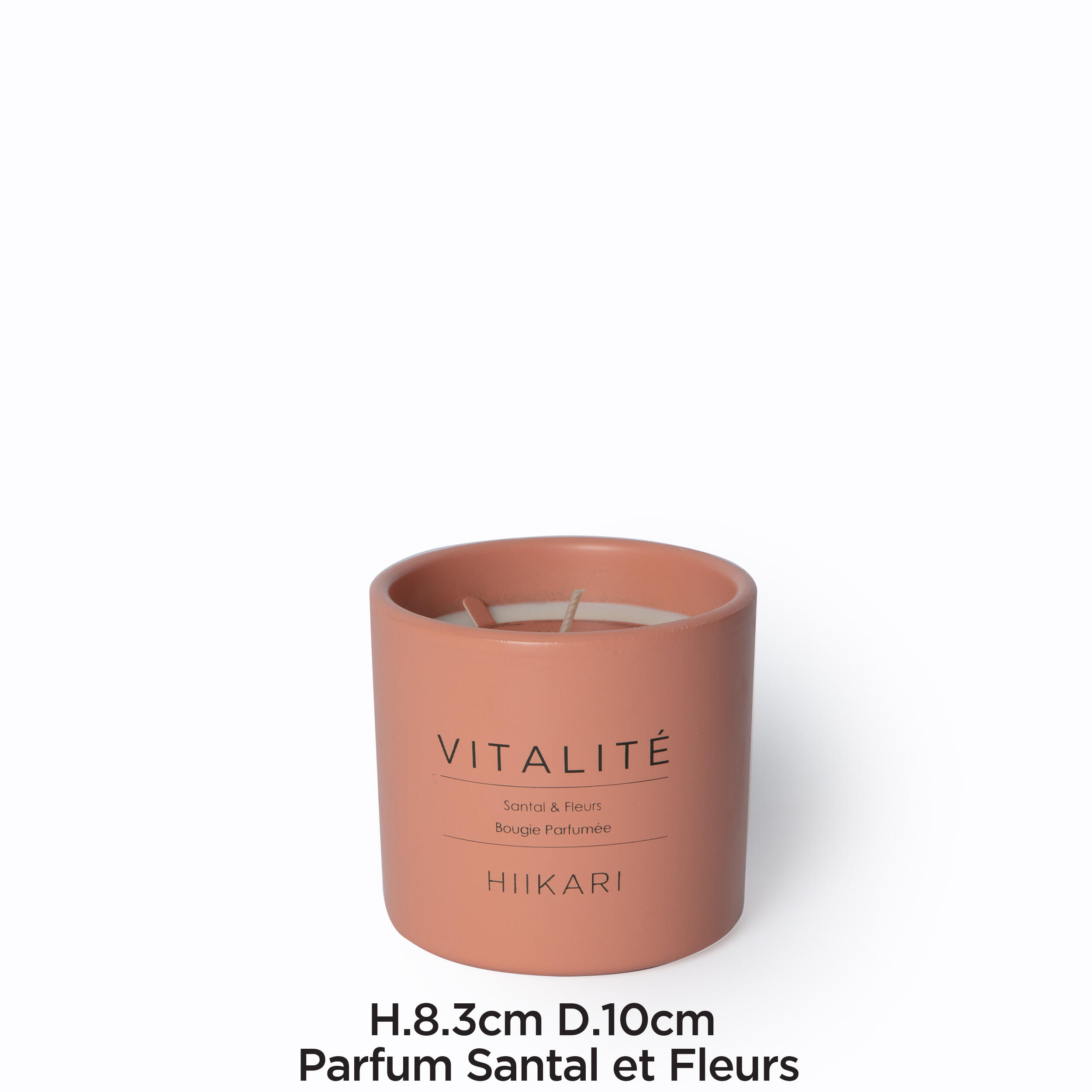 Vela branca, em castiçal de cerâmica terracota laranja. Seu design moderno de inspiração oriental é ideal para ambientes de sessões de ioga, relaxamento, leitura, etc. Tem duração aproximada de 38 horas e seu suave perfume floral oferece agradável sensação de bem-estar e harmonização. Altura 8,3 cm, diâmetro 10 cm.