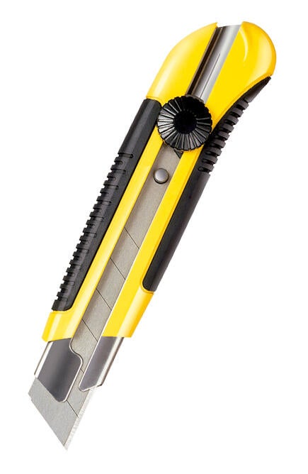 Cúter con cuerpo de plástico y hoja de acero inoxidable de 25 mm. Ideal para cortar papel y cartón.